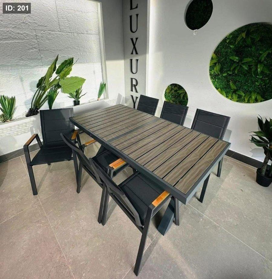 جمعاتك بتكبر مع طاولة الألمنيوم الذكية؛ جودة عالية وتصميم يتمدد من 180 إلى 240 سم بـ 6 مقاعد أنيقة. ✨