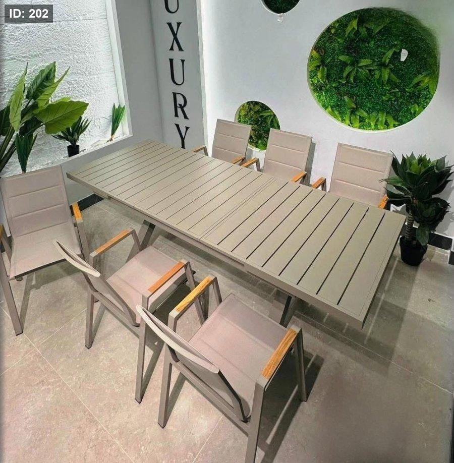 جمعاتك بتكبر مع طاولة الألمنيوم الذكية؛ جودة عالية وتصميم يتمدد من 180 إلى 240 سم بـ 6 مقاعد أنيقة. ✨