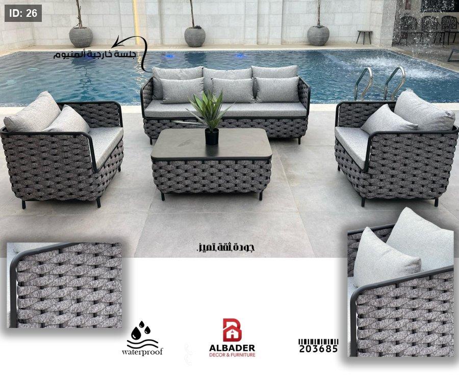 أضف لمسة من التميز والراحة لمنزلك مع طقم الجلسة الخارجية المصنوع من الألمنيوم بنظام الحبال المنسوجة الفاخرة. تصميم يجمع بين القوة والجمال ليكون الخيار الأفضل لحديقتك أو الترس.