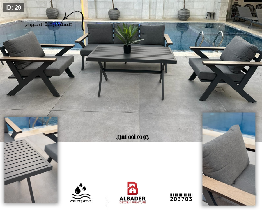 لعشاق الألوان الداكنة والراقية، نقدم لكم طقم الجلسة الخارجية باللون السكني الغامق تصميم "مودرن" جريء يضيف لمسة من الهيبة والجمال لأي مساحة خارجية.